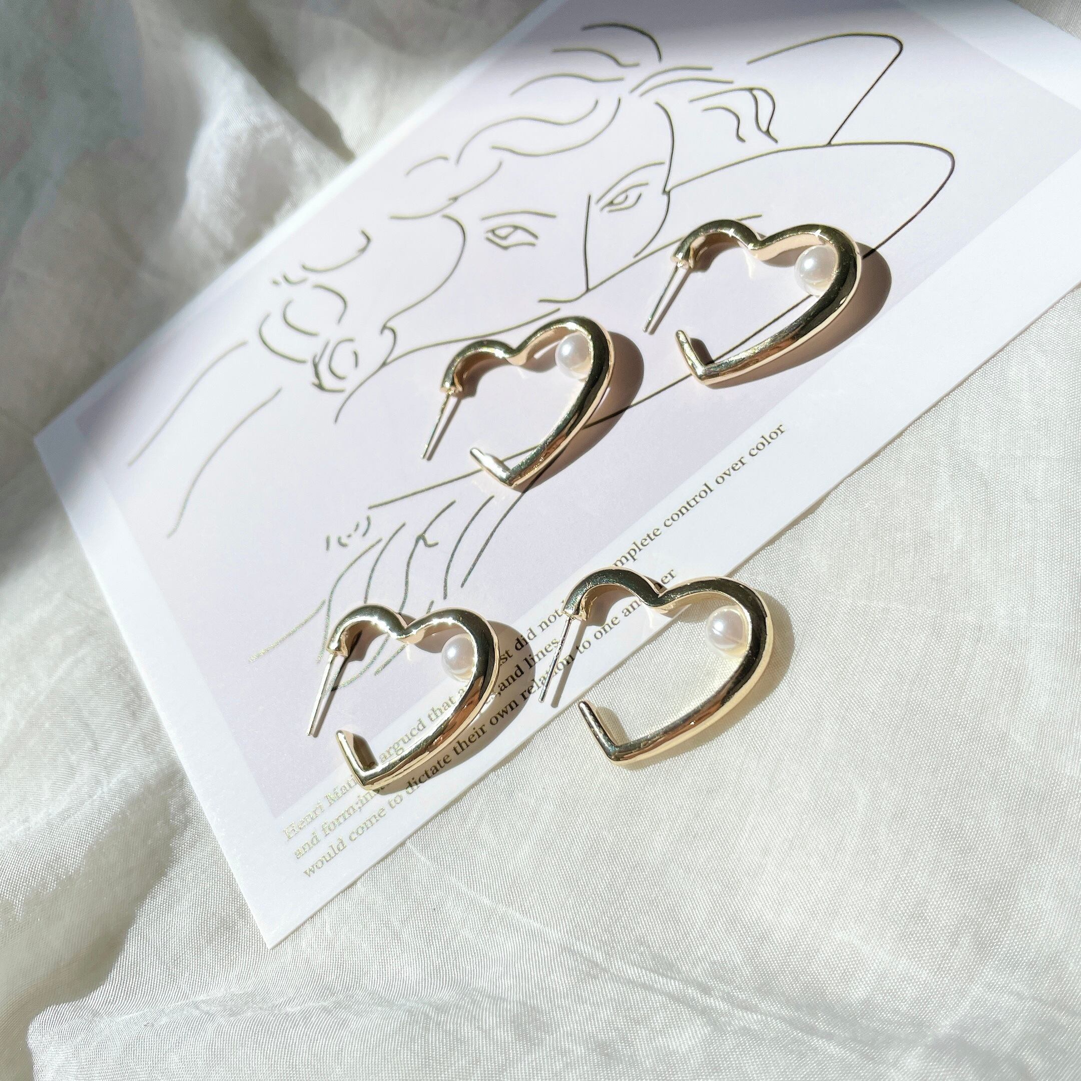 ハート型フレームにパールが一粒付いているかわいいシンプルなゴールドのピアスです。
